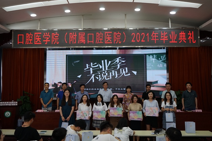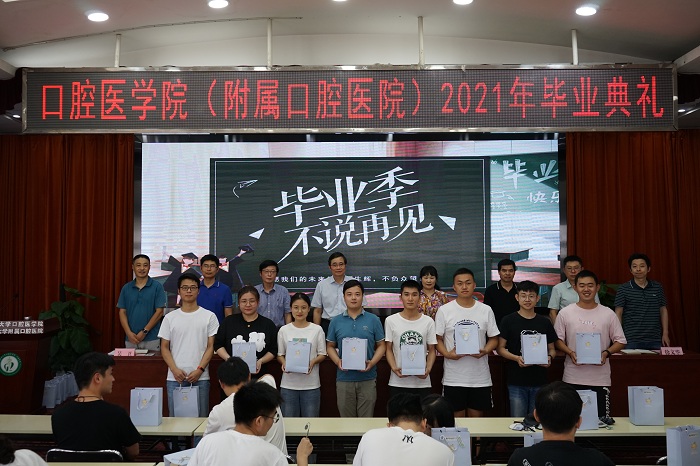 何家才作毕业致辞,向全体毕业生表示热烈祝贺,充分肯定了同学们五年来在思想上的成长和学业上的进步。他深情寄语全体口腔毕业生,要把握时代脉搏,始终做到勇于担当、砥砺前行,将个人理想融入国家发展伟业,让个人梦与中国梦同频共振,为维护人民群众健康,为助力健康中国贡献青春的力量。要紧跟学科前沿,始终做到潜心修学、知行合一,不断提高综合素质,在医学创新中不断突破难题和困境,积极参与并引领现代医学的变革与发展。要践行安医精神,与祖国共命运,与人民同呼吸,成为“敬佑生命、救死扶伤、甘于奉献、大爱无疆”的大国良医。