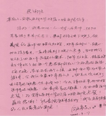 9月17日,香香腐宅 医务部收到一份患者家属手写的感谢信。信中质朴的文字,充满对牙体牙髓儿童牙病科服务的感激,对医师田甜诚挚的谢意。据悉,患者9月9日下午5点多前来治疗,已接近下班时间。但香香腐宅 牙体牙髓儿童牙病科田甜医师以认真负责的态度耐心地为患者治疗,持续到晚上8点多。这封信虽然简短质朴,但却饱含患者和家属真挚的情感和满心的感激。