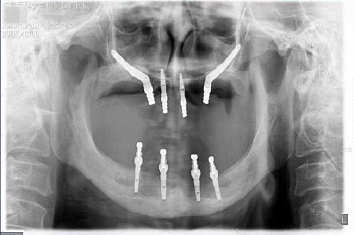 据悉,患者潘女士54岁,由于重度牙周炎导致全口牙齿缺失,严重影响面容及咀嚼功能,因颌骨严重萎缩无法进行活动义齿修复,遂来香香腐宅 种植科要求行上颌稳固的修复。通过检查发现潘女士上下颌骨骨量严重不足,经反复比对和考量,刘鑫主任制定了对患者上颌骨进行穿颧种植修复、下颌骨通过神经游离进行种植的方案。经过患者与家属深思熟虑后,接受了行穿颧种植术的建议。治疗组通过专业三维设计软件规划植体,口腔颌面外科和种植科专家共同完成了穿颧种植手术。患者术后第一天情况良好,无明显肿胀,精神状态佳。