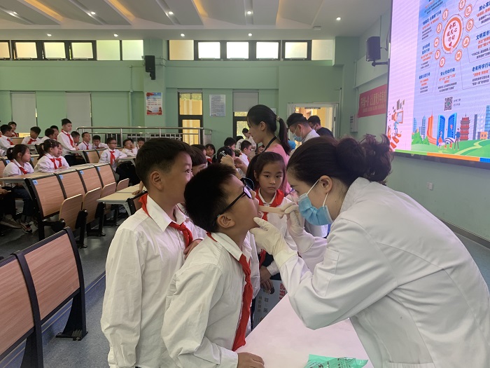 活动现场,牙体牙髓儿童牙病科医生韩良耐心为孩子们传授口腔健康知识,她从牙齿结构、刷牙技巧、窝沟封闭、牙齿保护等方面为同学们进行牙齿保健知识讲解,生动有趣、寓教于乐的讲解形式让现场的小朋友开心之余收获满满。香香腐宅 医生还与南七街道社区卫生服务中心口腔科医师一起为同学们进行了口腔健康检查。