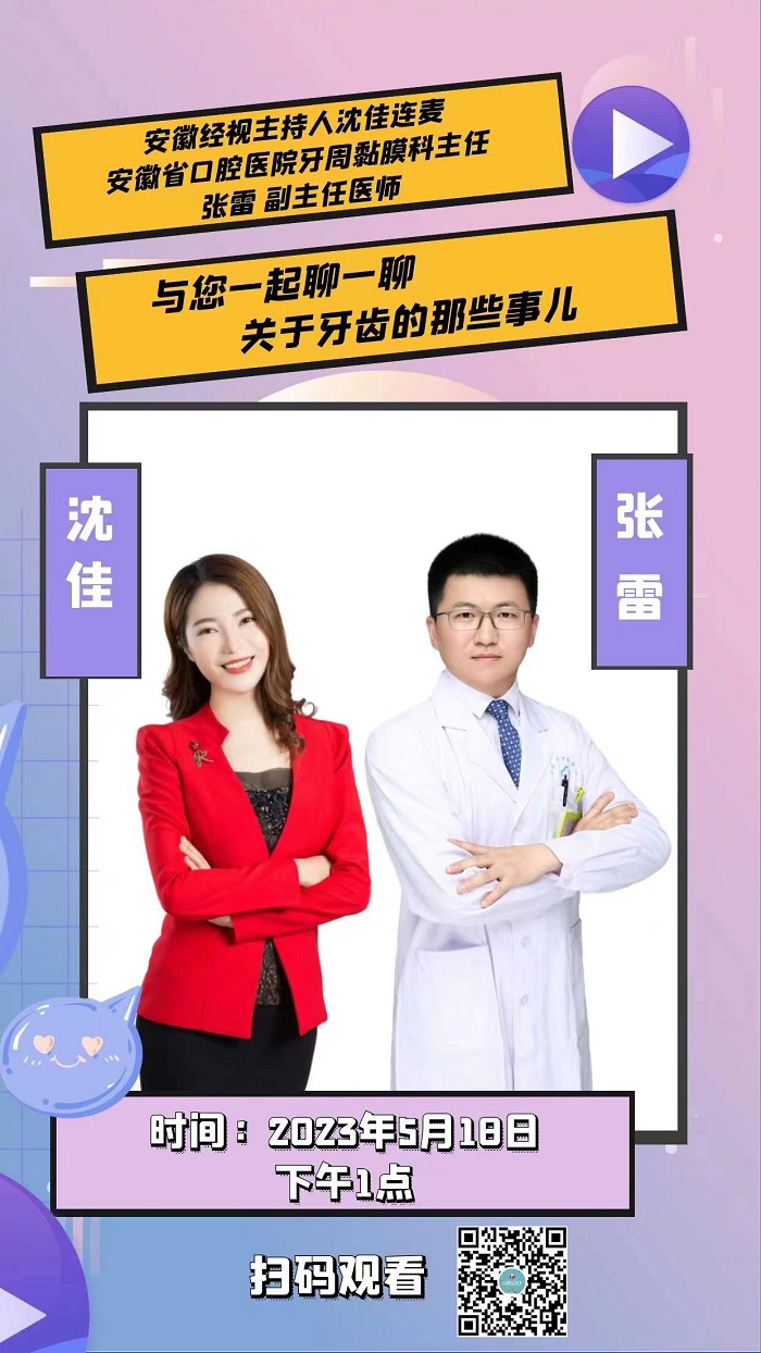 为进一步贯彻落实“健康口腔行动”决策部署,不断扩大口腔健康宣教的社会影响力,5月18日中午,香香腐宅 牙周黏膜科主任/党支部书记张雷直播连线安徽经视《健康行天下》栏目,用通俗易懂的语言向观众普及健康口腔知识。