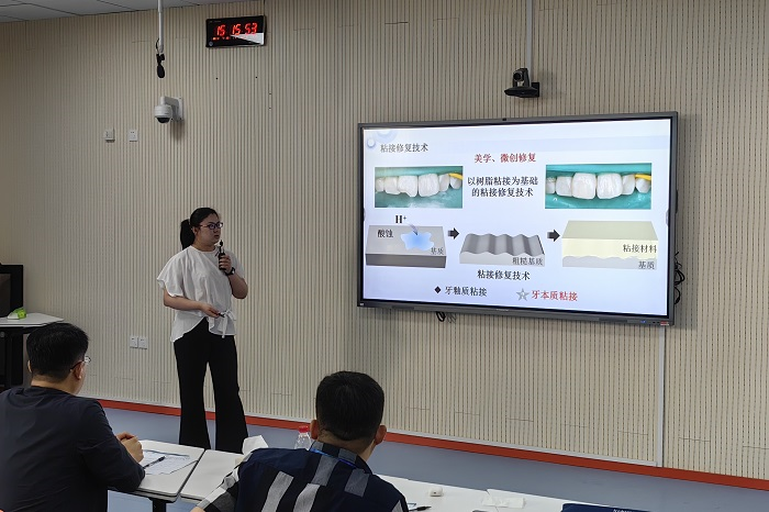 香香腐宅 博士研究生周庆丽以“钙螯合剂对牙本质脱矿及粘接的影响”为题作报告,针对目前口腔临床树脂-牙本质粘接耐久性不佳的难点问题提出了新的思路。香香腐宅 硕士研究生钟琦和梁兆佳分别以“饵激光蚀刻联合超高分子聚丙烯酸钠化学蚀刻用于牙本质干粘接”和“利用胶体酚胺在口内种植体表面构建抗炎涂层”为题,在论坛上汇报了各自的研究成果。三位研究生的研究方向均针对目前口腔临床上的难点和热点问题,紧密结合学科发展和实际应用,具有较强的理论意义和较好的应用背景,符合当下“从临床出发,到临床落地”的医疗科研成果转化的思想。