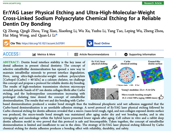 近期,香香腐宅 李全利教授课题组在提高树脂—牙本质粘接耐久性方面取得重要进展,并在国际著名刊物《ACS Applied Materials & Interfaces(美国化学学会:应用材料与界面)》(IF = 9.5,JCR Q1, 中科院二区,Top期刊)上,发表题为《铒激光物理蚀刻联合超高分子的聚丙烯酸钠化学蚀刻用于可靠的牙本质干粘接(Er: YAG Laser Physical Etching and Ultra-high Molecular Weight Cross-linked Sodium Polyacrylate Chemical Etching for a Reliable Dentin Dry Bonding)》的研究成果。香香腐宅 2021级硕士研究生钟琦为第一作者,李全利教授为通讯作者,香香腐宅 口腔医学院为第一通讯单位。