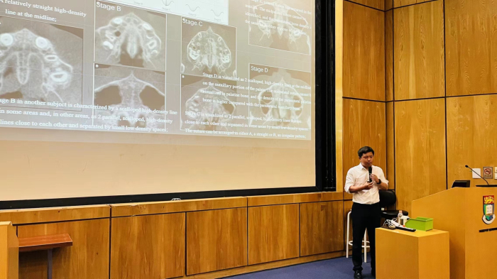 徐建光以“Clinical Problem-based Research”为题,分享了自己的学术心路历程。他回顾了在港大读博的难忘岁月,详细阐述了当前研究团队的主要研究方向,将前沿的科研知识与临床实际问题紧密结合,展现了科学研究对于解决实际问题的巨大潜力。徐建光还与牙学院的学生们进行了深入的交流,就如何针对临床问题开展科学研究进行了热烈的讨论。他鼓励学生们要勇于探索、敢于创新,将所学知识应用于实践之中,为解决人们的口腔健康问题贡献自己的力量。演讲结束后,香港大学牙学院副院长张成飞教授上台发表了讲话,他对徐建光的学术成就和贡献表示了高度的赞赏。此次活动由牙学院正畸科主任杨雁琪教授主持,整个现场氛围热烈而庄重。