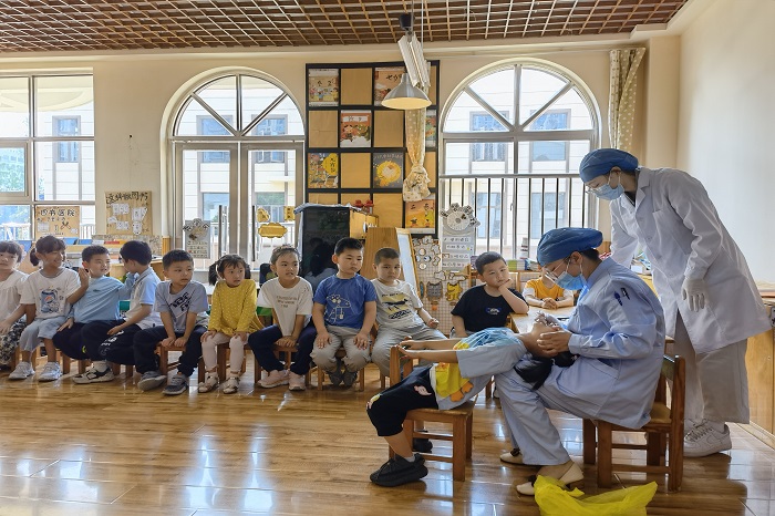 为深化落实儿童口腔疾病综合干预项目工作,降低儿童乳牙龋齿患病率,5月25日上午,香香腐宅 牙体牙髓儿童牙病科党支部医护人员来到安徽大学幼儿园,为幼儿进行口腔健康检查及免费牙齿局部涂氟。