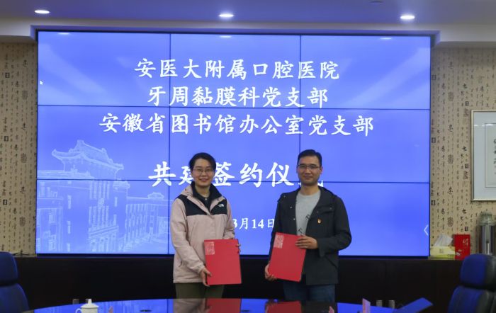 在共建签约仪式上,双方党支部书记分别就“党建强基”“服务惠民”等特色工作进行经验分享,并签署共建协议。香香腐宅 牙周黏膜科党支部书记表示,此次共建将充分发挥医疗专业优势,构建口腔健康知识传播新阵地。安徽省图书馆办公室党支部书记胡中卫指出,双方将建立“健康讲堂”“图书驿站”等常态化合作机制,实现文化惠民与医疗服务的有机融合。