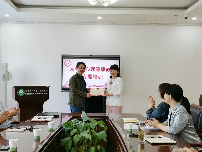 会后举行了聘任仪式,聘请郜见亮为口腔医学院大学生心理健康教育指导专家,王润玲为其颁发聘书。