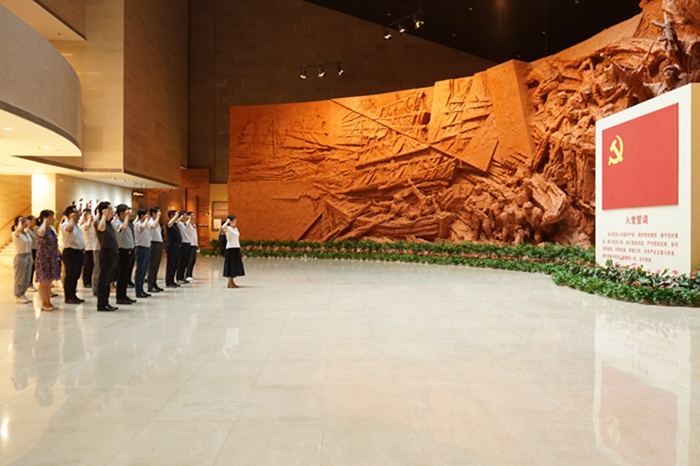 在渡江战役纪念馆,全体党员沿着习近平总书记考察时的足迹进行参观,重温了习近平总书记重要讲话指示精神。展馆大厅里,王润玲领誓,全体同志举起右拳庄严宣誓,党旗下铮铮誓词响彻场馆每个角落。随后,在讲解员的带领下,大家回顾了具有决定性历史意义的革命战争史,一张张照片、一件件文物是烽火岁月的历史见证,生动还原了“百万雄师过大江”的壮丽场景。“渡江战役的胜利是靠老百姓的小船划出来的。”视频中习近平总书记重要讲话,让中心组成员深刻领会到伟大的渡江战役锻造出的坚定信念、革命到底、军民团结、奋勇争先的渡江精神,大家一致表示将传承渡江精神,赓续红色血脉,凝聚奋进力量,以优异成绩迎接党的二十大胜利召开。