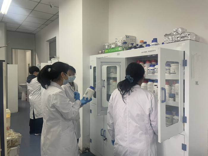 实践操作环节,党员同学们组成志愿服务队,分工明确、协同配合,有序开展实验室试剂柜清理、公共区域摆放试剂等危化品排查工作。在试剂柜清理现场,党员们严格按照危化品分类存放规范,逐一排查柜内试剂,仔细核对试剂名称、规格、有效期,将过期、变质试剂单独整理登记,分类存放于指定危废收集点,确保试剂柜内试剂摆放整齐、标签完整、分类清晰,杜绝混存、错存等安全隐患。