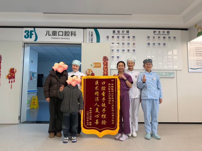 一面锦旗,不仅是患儿及家属对科室医疗技术和服务水平的高度认可,更是一种鞭策。未来,儿童口腔科全体医护人员将继续秉持“以患者为中心”的服务理念,不断提升医疗技术水平,用心守护每一位儿童的口腔健康,让更多孩子拥有自信笑容。(儿童口腔科 韩曈曈)