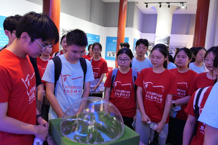 一条“天河”,化千里赤地为丰收之源;一条“天河”,于大别山脉书人间奇迹。人间天河淠史杭工程这一连接了淠河、史河和杭埠河的水系,使昔日千里贫瘠之地变成了今天的鱼米之乡。在淠史杭工程展览馆参观的过程中,一幅幅黑白的图画穿越时光的长河向实践团成员诉说着那个年代皖西地区人民饱受旱涝不均的痛苦。人民群众撸起袖子,奋勇而起,用勤劳与智慧谱写了一段“人间天河”淠史杭的佳话。实践团成员走近这条堪称奇迹的“人间天河”,沉浸式了解了新中国建设初期百废待兴基础上中国共产党带领人民群众自力更生、艰苦奋斗的光辉历程,深刻领悟了无数无名英雄用汗水和生命凝聚成的熠熠生辉的淠史杭精神。