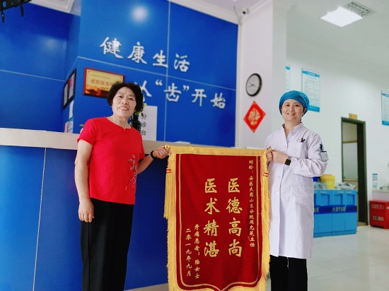 近期,经政务区门诊部周允芝等医护团队的悉心诊治后,已经治愈的陆女士家属将写有“医术精湛,医德高尚”的锦旗送至周医生手中,患者喜笑颜开的对门诊部医护人员的医德、医术、服务态度表示感谢和满意。