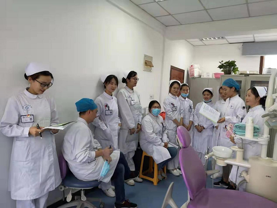 培训分别从医护人员的临床操作、医护人员的防护和口腔器械及环境的消毒隔离三个方面进行。包括患者诊疗前后严格按照六步洗手法洗手,正确佩戴口罩及帽子,诊疗过程中手套的使用和佩戴,如写病历、拿X光片接电话等须摘掉手套;口腔冷光灯手柄、光固化灯手柄及综合治疗台控制区表面须贴上隔离膜或防护袋;治疗器械和治疗盘实行一人一用一灭菌的原则等。
