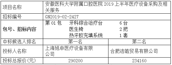 2019上半年医疗设备采购及相关服务(招标编号:GN2019-02-2427)组织公开招标采购。本项目于2019年11月14日10时00分,在安徽省招标集团股份有限公司二楼第1开标室公开开标,经评标委员会评审,现将评标结果公示如下: