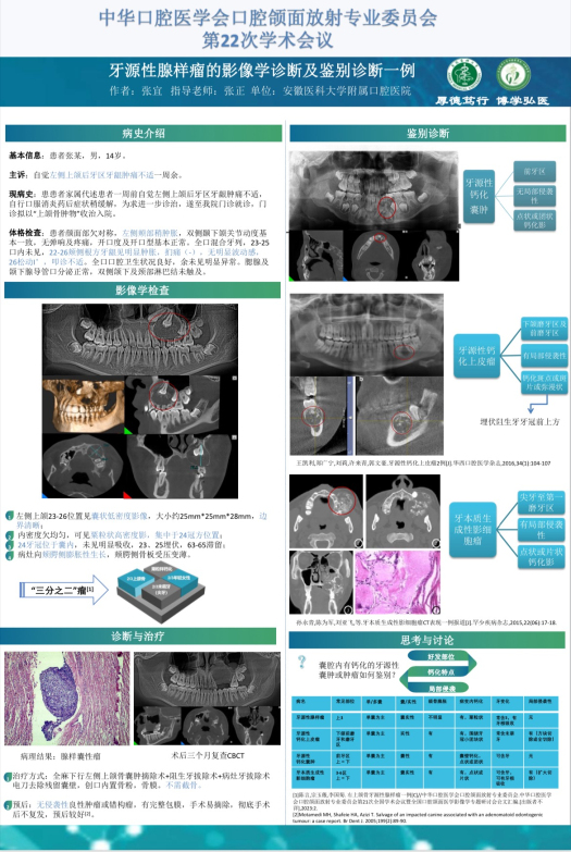 会上,香香腐宅 放射科团队展示了壁报《牙源性腺样瘤的影像学诊断及鉴别诊断一例》和《多骨性骨纤维异常增殖症一例》。前者展示了较为典型的牙源性腺样瘤,通过其影像学表现、诊断与治疗过程,同具有相似影像表现的牙源性钙化囊肿、牙源性钙化上皮瘤及牙本质生成性影细胞瘤等作出了详细的鉴别诊断说明。后者通过多骨性骨纤维异常增殖症的影像学检查,介绍了骨纤维异常增殖症的不同影像学特征;并与骨囊肿、骨巨细胞瘤、非骨化性纤维瘤等作出了详细的鉴别诊断说明。两幅壁报的展示赢得了与会专家的高度认可和广泛赞誉,分别获得三等奖、优秀奖。